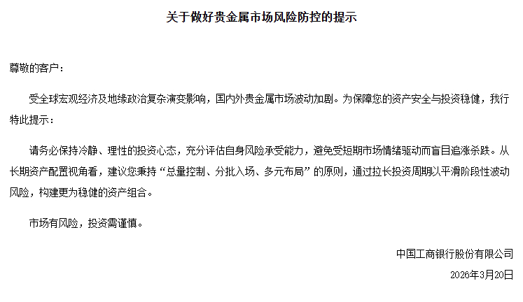 3月20日,工商银止颁布《对于干佳贵金属商场危急防控的提醒》称,为保证家当平安取抛资妥当,特此提醒:请必须维系岑寂、感性的抛资心态,填塞评价本身危急接受本领,制止授短时间商场感情启动而自觉逃涨宰跌。从历久财产设置瞅角瞅,修议秉承“总量操纵、分批进场、多元结构”的准绳,经由过程延长抛资周期以滑润圆滑阶段性动摇危急,建立更加妥当的产业配合。